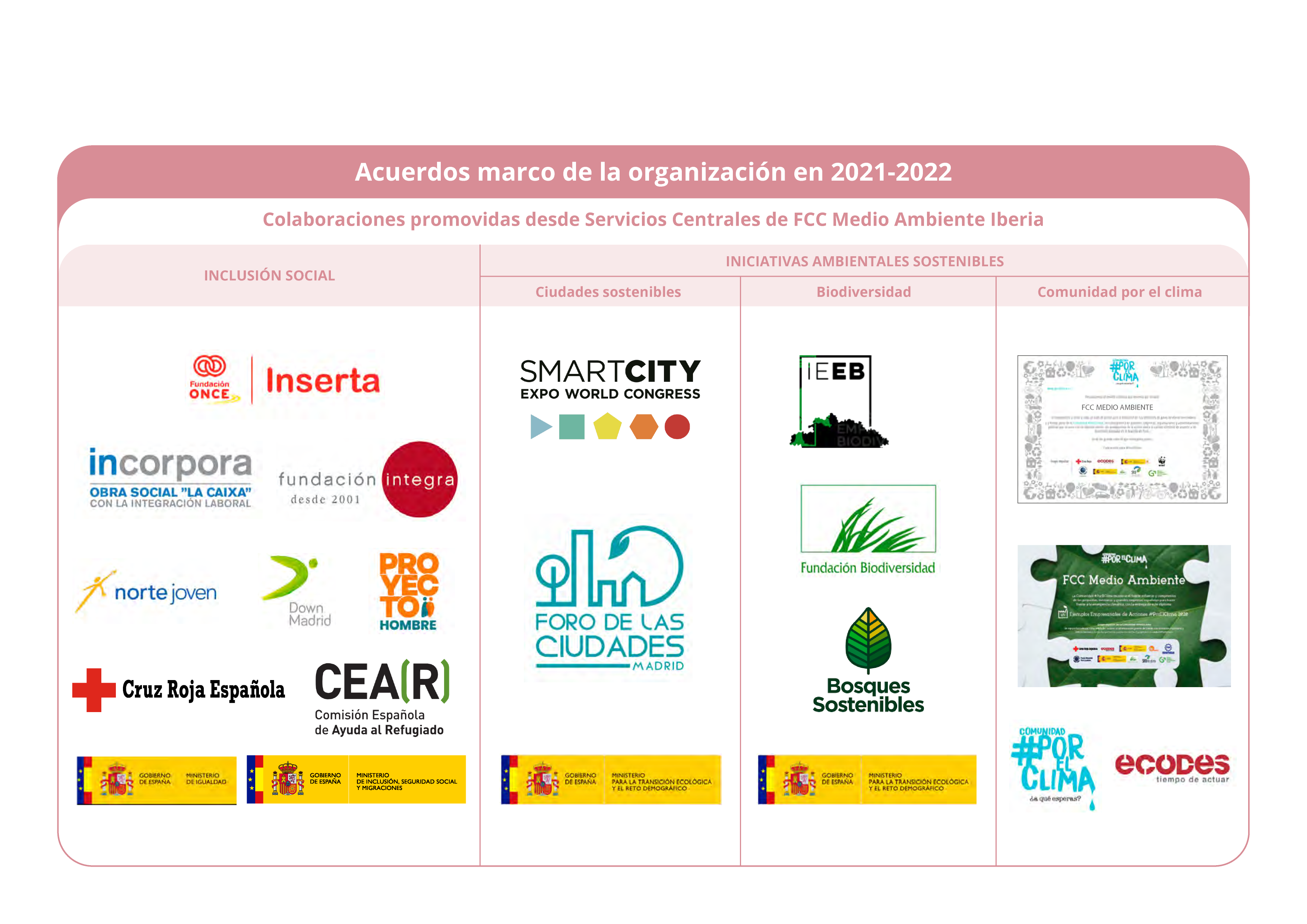 A través de las diferentes iniciativas, acuerdos y convenios marco firmados con instituciones y asociaciones, FCC Medio Ambiente Iberia ha creado una red de alianzas que constituye uno de los motores de la sostenibilidad para la organización, con el objetivo de reforzar su actuación en materia social y medioambiental a través de