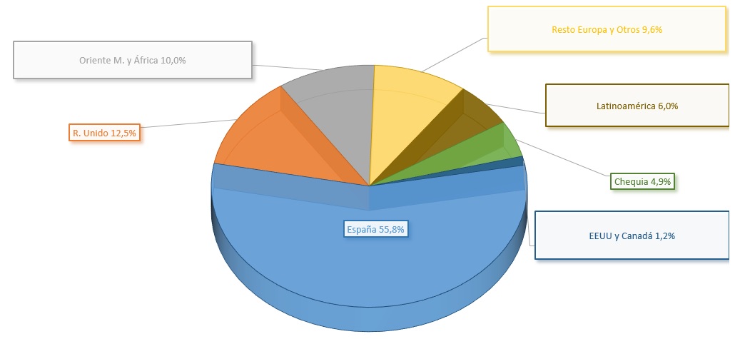 Revenue percentage by Geographical Area: Rest of Europe and Others 9,6%, Middle East and Africa 10,0%, UK  12,5%, Latin America 6,0%, USA and Canada 1,2%, Czech Republic 4,9%, Spain 55,8%.