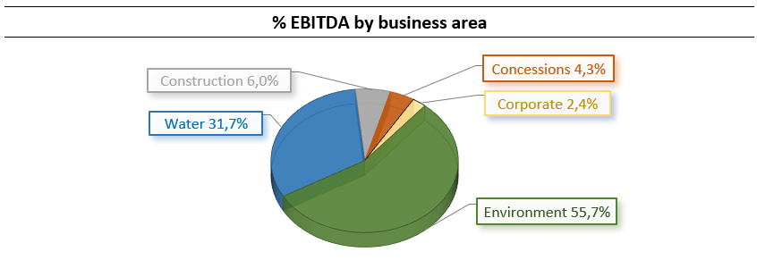 EBITDA was €1,419.1 million in the year, which represents a slight decrease of 1.1% compared to the previous year. This change is primarily explained by the adjustment made in the Construction Area during the last quarter, resulting from the development of international projects, their revenue performance depending on their progress and the revised estimated costs to complete them.