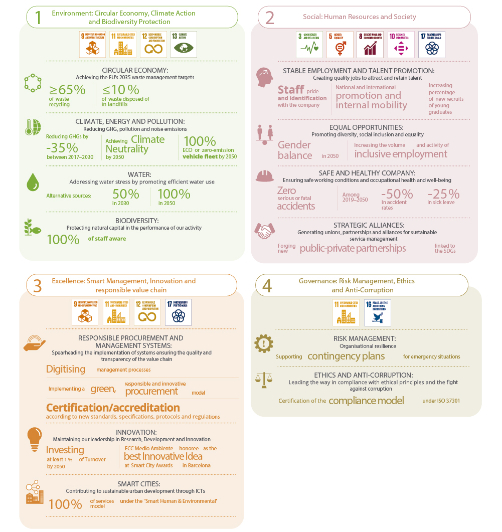 FCC Medio Ambiente launched its Sustainability Strategy 2050 on March 2021. This new strategy represents our commitment to protect and respect the Earth and contribute to the fulfilment of the SDGs of the United Nations 2030 Agenda. It specifically contemplates actions to achieve those most directly related to our activities, so as to maximise the effect on the 17 SDGs as a whole. This new strategy represents a long-term strategic vision for a more prosperous, modern, competitive and climate-neutral world.