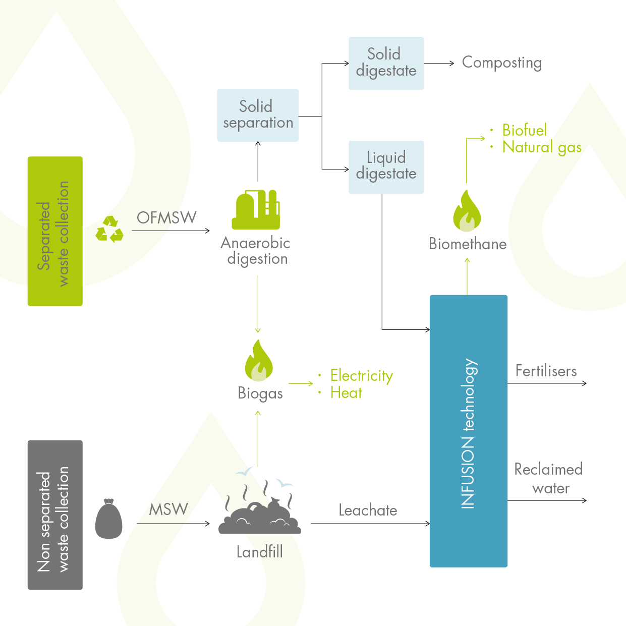 INFUSION aims to demonstrate and validate on a pilot scale a water purification treatment for landfill leachate and OFMSW liquid digestate based on the perspective of the circular economy, in order to recover resources (biogas, bio-fertilizers, and regenerated water). This system will be based on a treatment that combines various technologies of biological treatment and filtration and will be validated at pilot scale in two waste management centres: Ecoparc 2 in Montcada i Reixac, Barcelona, and COGERSA in Gijón, Asturias.