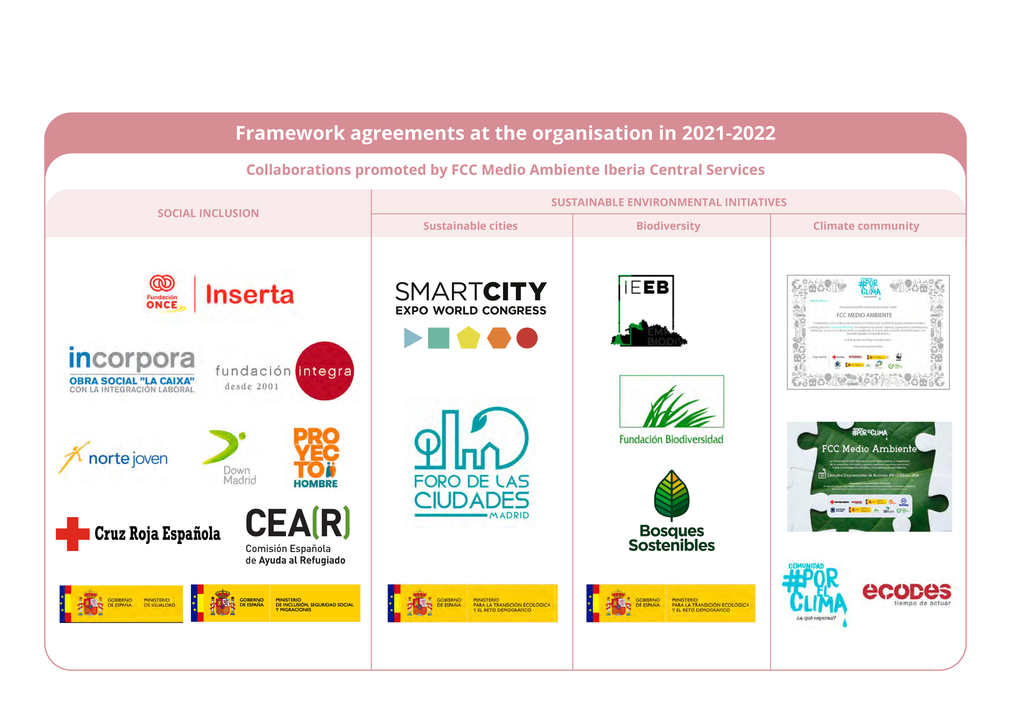 FCC Medio Ambiente Iberia has forged a network of alliances through a range of initiatives, contracts and master agreements entered into with numerous institutions and associations, and this network is an essential cornerstone of sustainability for the organisation to bolster its social and environmental innovation-related activities.