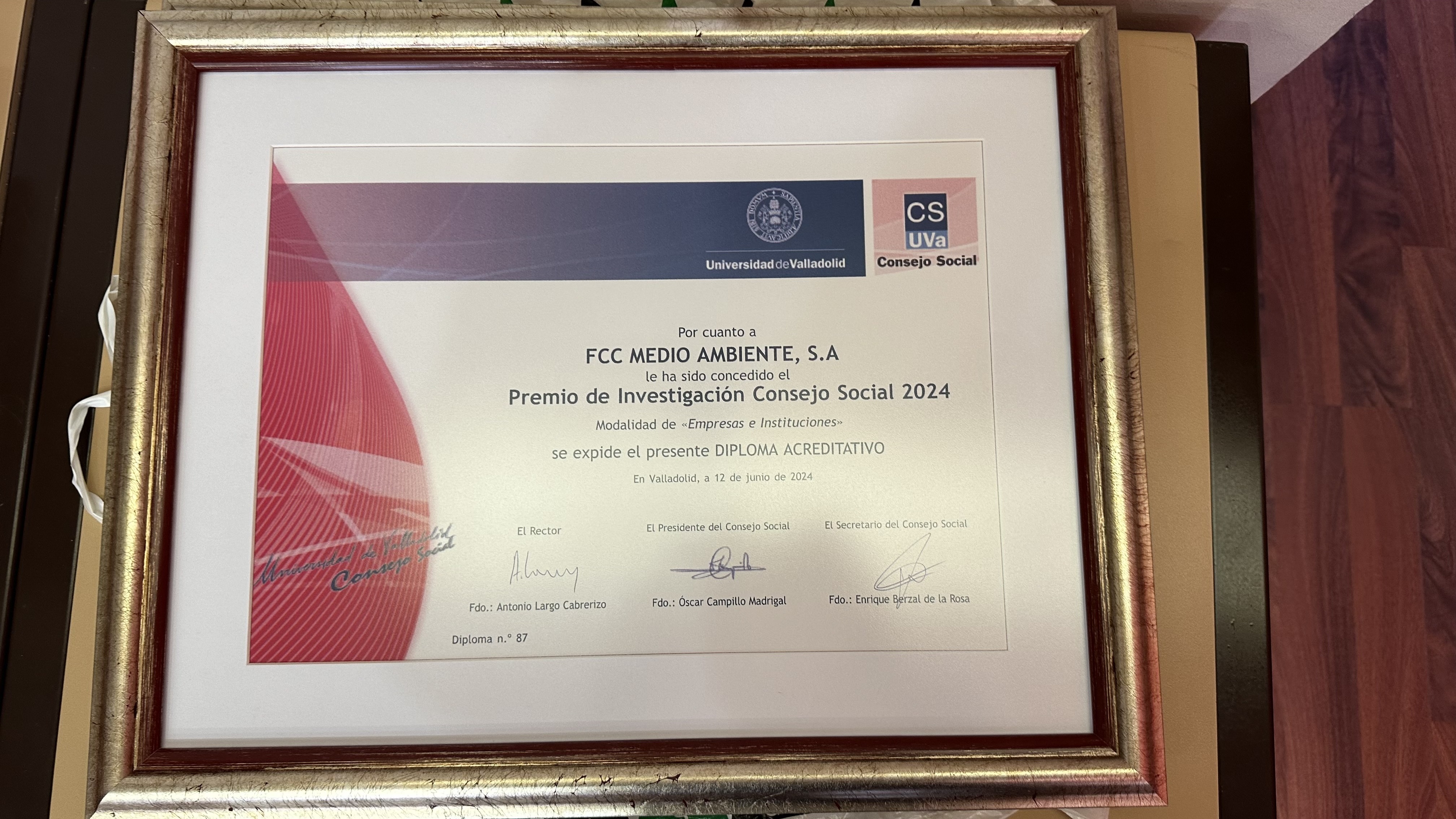 Yesterday, the University of Valladolid (UVa) presented the Social Council Research Award in the company category to the FCC Group for its commitment and collaboration in research, scientific development and technological innovation activities and projects, specifically for the Deep Purple, Life ABATE and ECLOSION projects in which FCC Medio Ambiente and Aqualia participate. On behalf of FCC Medio Ambiente, the award was collected by Francisco José Huete, Director of Management Systems.